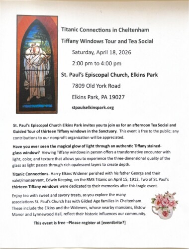 Saturday, September 13, 2025 – 1st session 4:30-6:00 p.m., 2nd session 7:00-8:30 p.m. The Friends of St Paul’s Association is pleased to sponsor the 2nd Soundbath event happening at St. Paul’s Church Elkins Park! Requested donation is $25 in advance and $30 at the door, but no one will be turned awa…